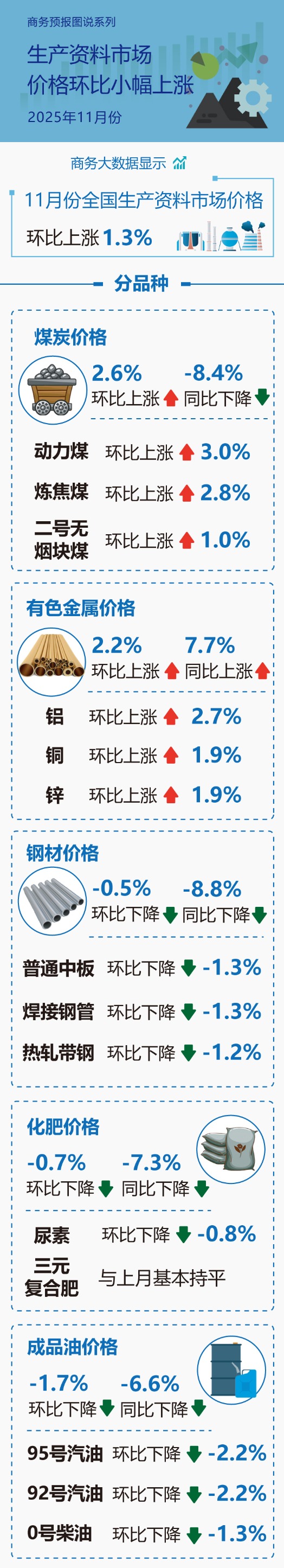 据商务部消息,商务大数据显示,11月份全国生产资料市场价格环比上涨1.3%。