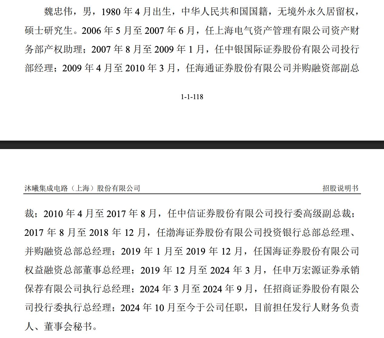 在二级市场的狂欢中,公司财务负责人兼董秘魏忠伟成为了圈内热议的赢家。资料显示,现年45岁的魏忠伟拥有深厚的投行履历,曾在海通证券、中信证券、申万宏源承销保荐及招商证券等头部券商任职,从业时间长达18年。2024年10月,他正式告别投行加入沐曦股份。