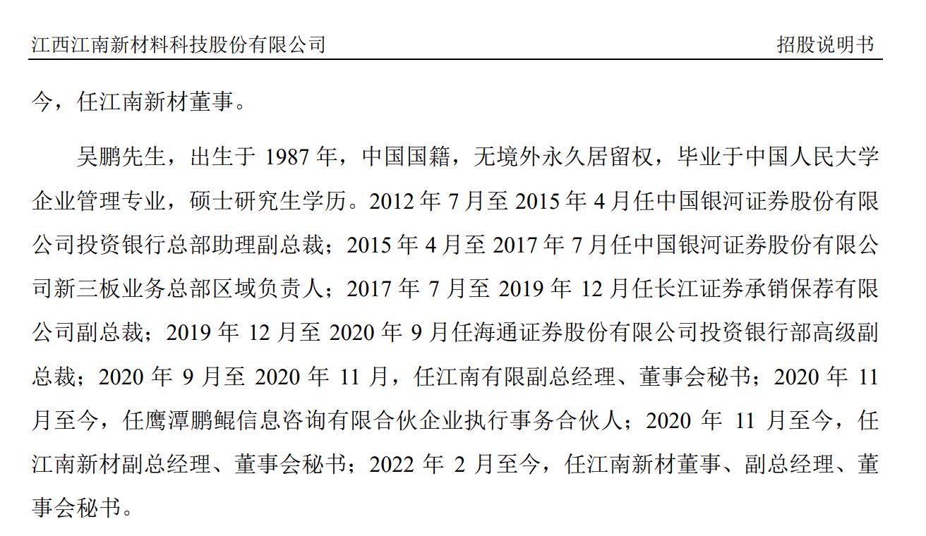 2025年3月20日,江南新材上市首日涨幅达到606.83%。公司副总经理兼董秘吴鹏同样出身投行,曾先后任职于银河证券、长江证券承销保荐和海通证券。吴鹏在2020年9月入职江南新材,当月即参与了股权激励,通过持股平台持有161.72万股。按上市首日收盘价74.50元计算,吴鹏的身家高达1.2亿元。