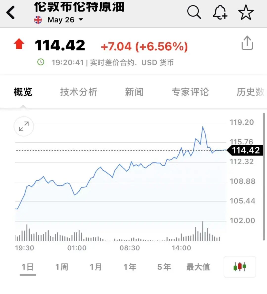 布伦特原油短暂冲高到每桶119美元后有所回落,目前涨6.56%,每桶报114.42美元。