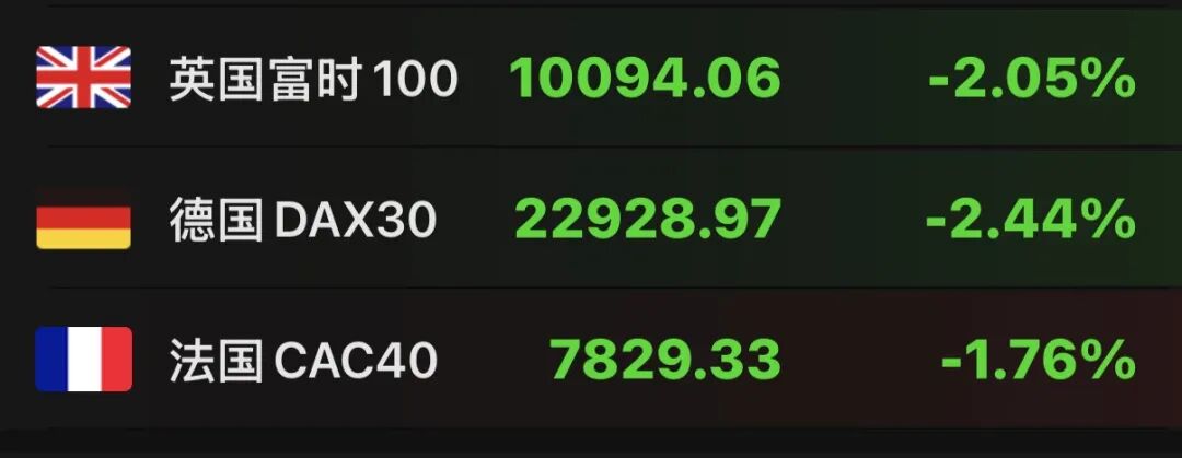 欧洲主要股指多数走低,英国富时100指数、德国DAX指数跌超2%,法国CAC40指数跌1.76%。