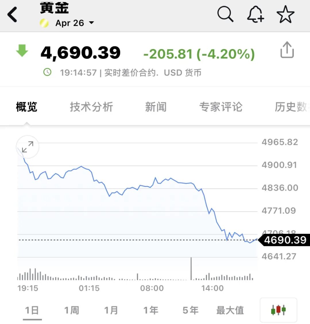 现货黄金盘中大跳水。截至发稿,现货黄金跌超4%,至4690.39美元/盎司。