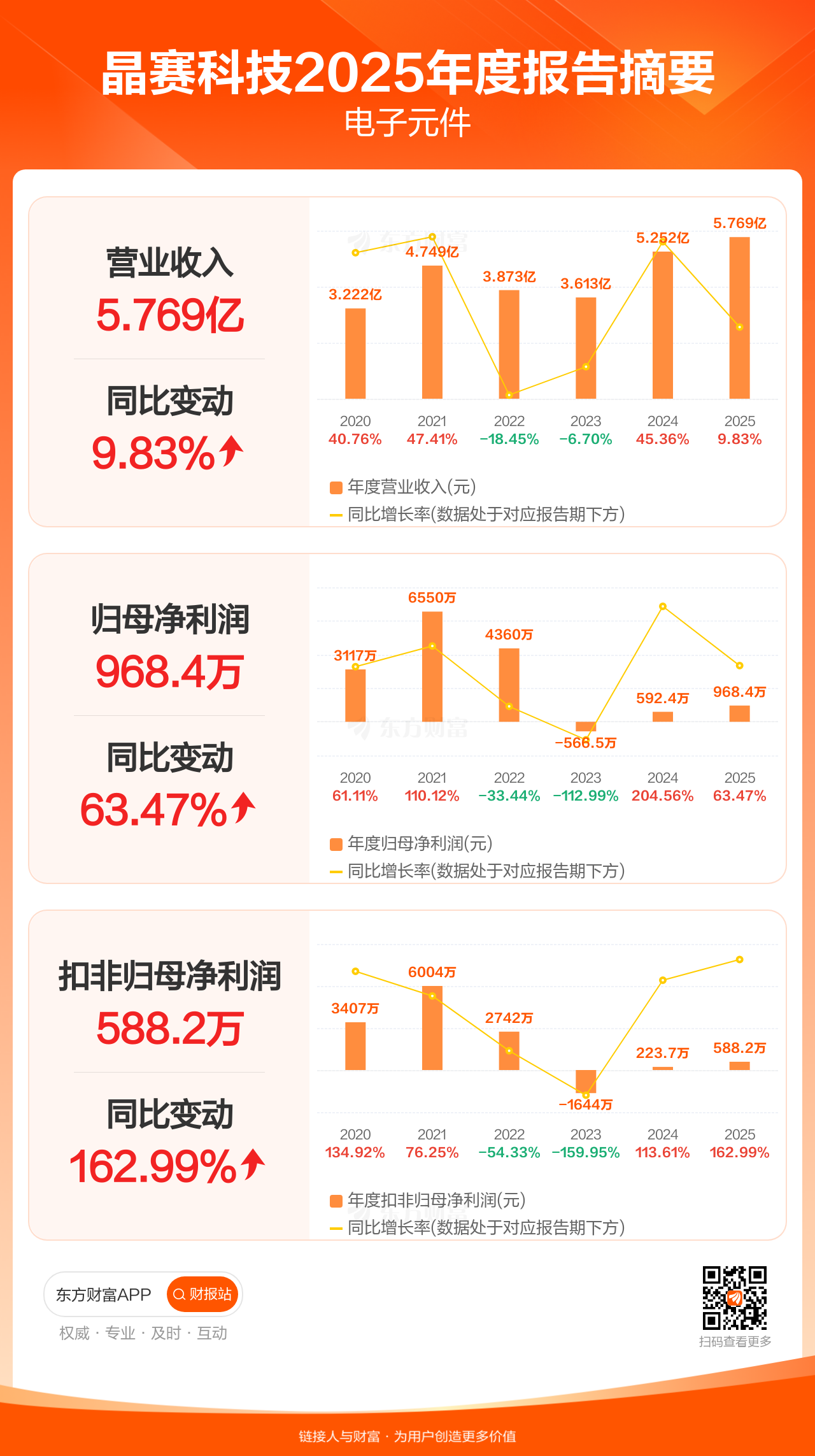 晶赛科技3月19日发布2025年年报显示,公司全年实现营业收入5.77亿元,同比增长9.83%;归母净利润968.37万元,同比增长63.47%;扣非归母净利润588.22万元,同比增长162.99%。