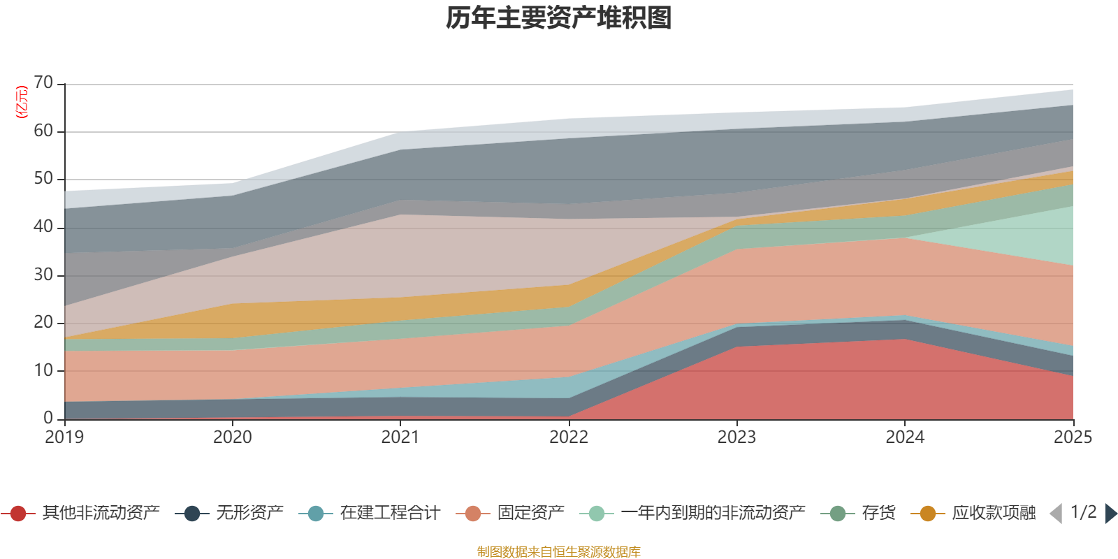 资产重大变化方面,截至2025年末,公司一年内到期的非流动资产较上年末增加19925.88%,占公司总资产比重上升17.91个百分点;其他非流动资产较上年末减少46.27%,占公司总资产比重下降12.66个百分点;货币资金较上年末减少29.61%,占公司总资产比重下降5.17个百分点;在建工程合计较上年末增加109.59%,占公司总资产比重上升1.5个百分点。