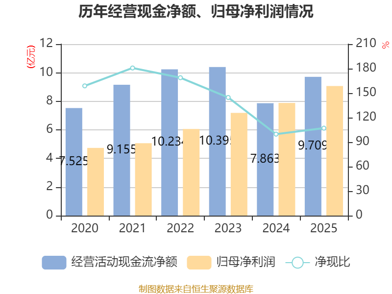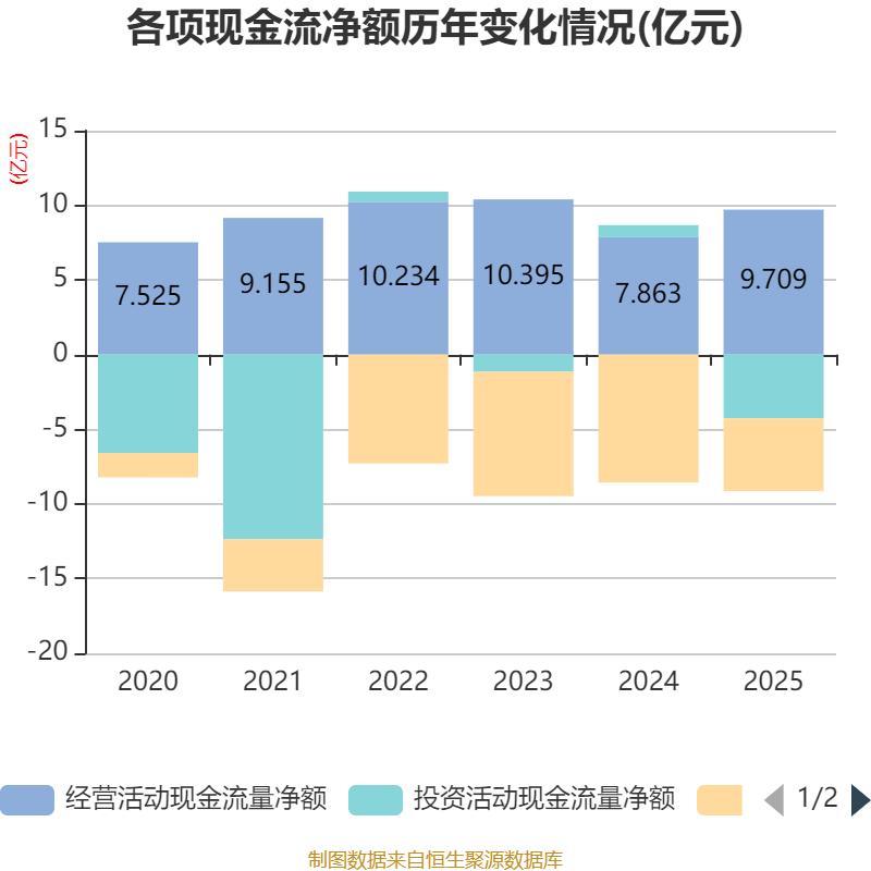 截至2025年,公司经营活动现金流净额为9.71亿元,同比增长23.48%;筹资活动现金流净额-4.87亿元,同比增加3.7亿元;投资活动现金流净额-4.26亿元,上年同期为8096.95万元。