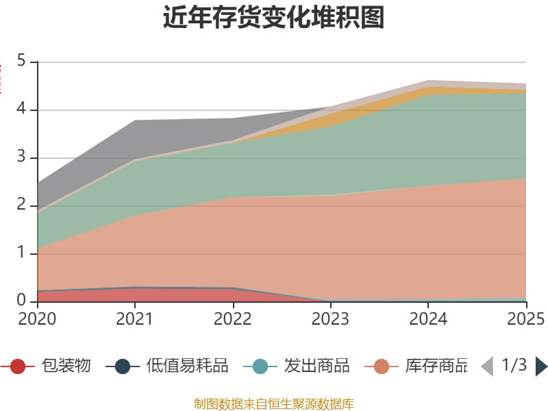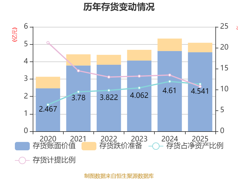 从存货变动来看,截至2025年末,公司存货账面价值为4.54亿元,占净资产的11.29%,较上年末减少689.34万元。其中,存货跌价准备为5452.26万元,计提比例为10.72%。