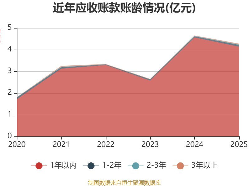 从应收账款账龄结构来看,截至2025年末,公司账龄在1年以内的应收账款余额为4.13亿元,较上年末下降4260.43万元,占应收账款总额比例为96.72%,较上年末下降1.39个百分点。