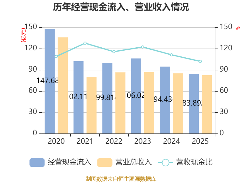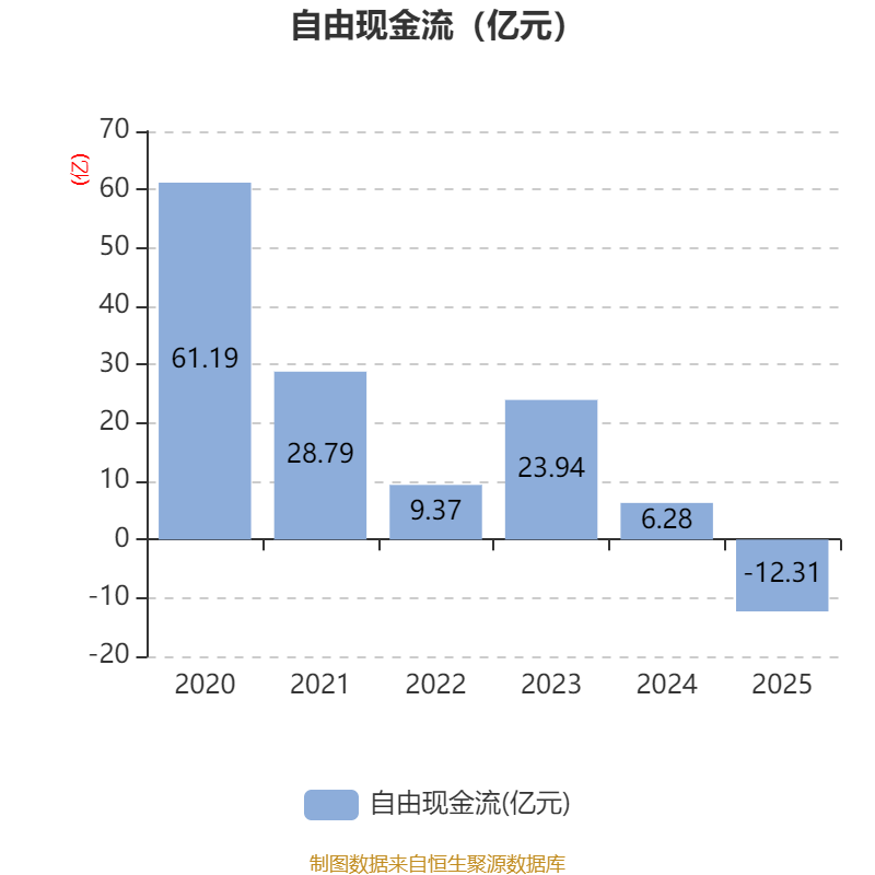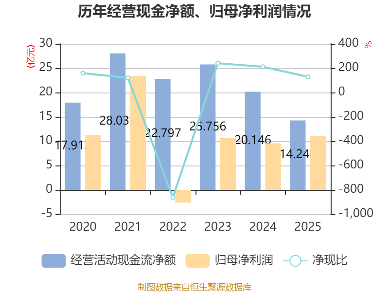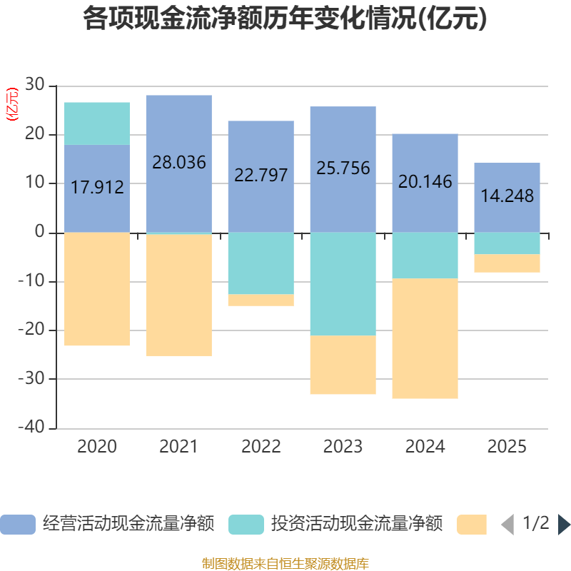 截至2025年,公司经营活动现金流净额为14.25亿元,同比下降29.28%;筹资活动现金流净额-3.7亿元,同比增加20.84亿元;投资活动现金流净额-4.46亿元,上年同期为-9.41亿元。