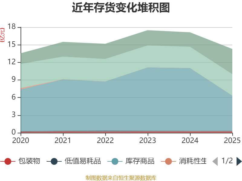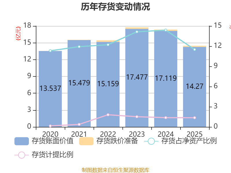 从存货变动来看,截至2025年末,公司存货账面价值为14.27亿元,占净资产的11.5%,较上年末减少2.85亿元。其中,存货跌价准备为1961.29万元,计提比例为1.36%。