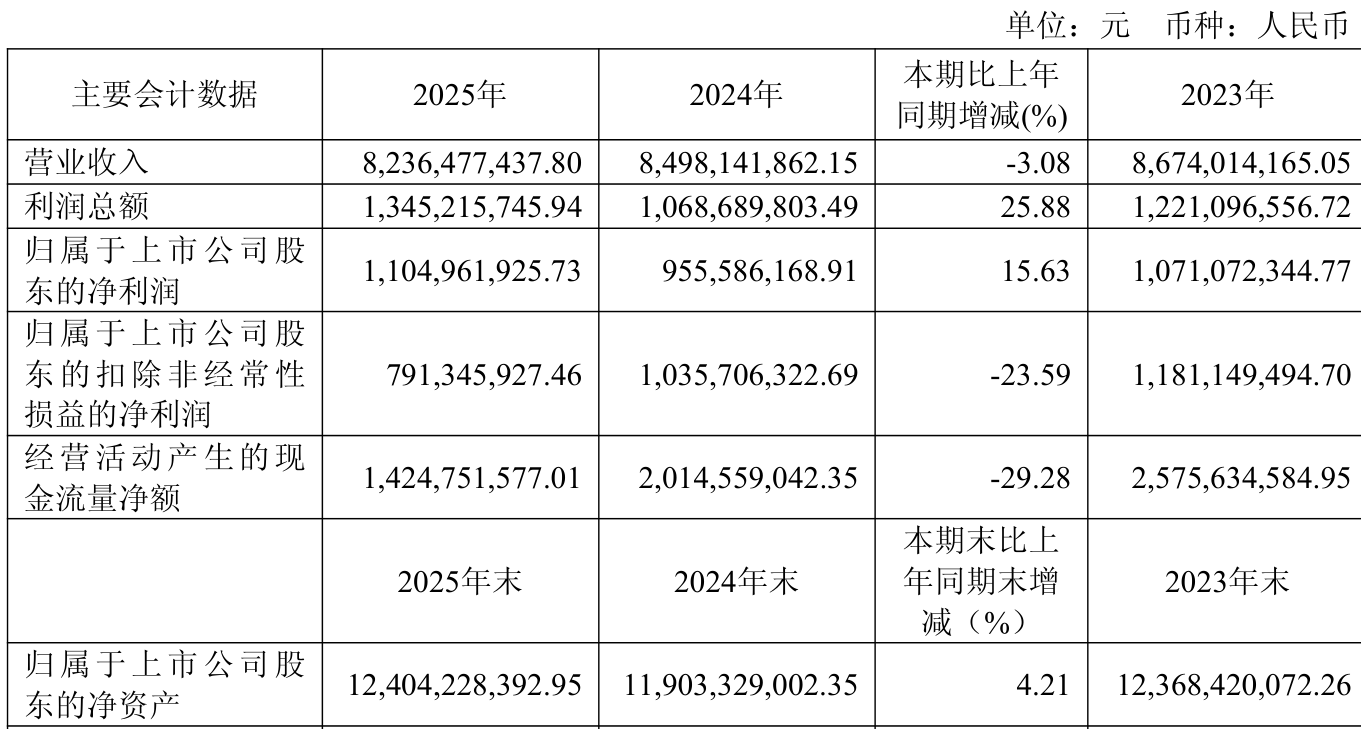 中证智能财讯天士力(600535)3月20日披露2025年年度报告。2025年,公司实现营业总收入82.36亿元,同比下降3.08%;归母净利润11.05亿元,同比增长15.63%;扣非净利润7.91亿元,同比下降23.59%;经营活动产生的现金流量净额为14.25亿元,同比下降29.28%;报告期内,天士力基本每股收益为0.74元,加权平均净资产收益率为9.09%。公司2025年度分配预案为:拟向全体股东每10股派现1元(含税)。