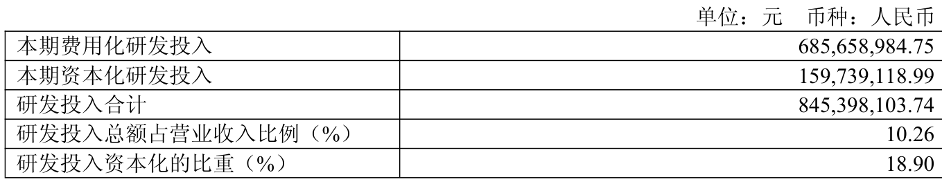 2025年全年,公司研发投入金额为8.45亿元,同比下降18.64%;研发投入占营业收入比例为10.26%,相比上年同期下降1.97个百分点。此外,公司全年研发投入资本化率为18.9%。