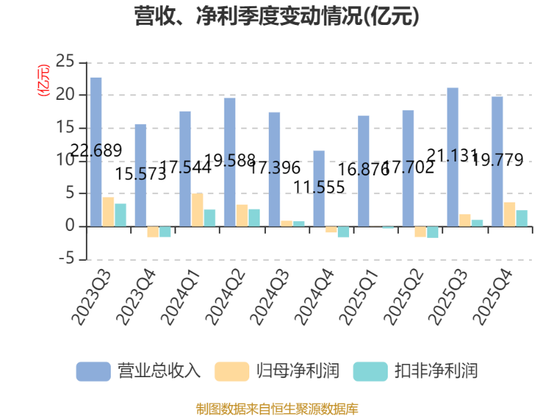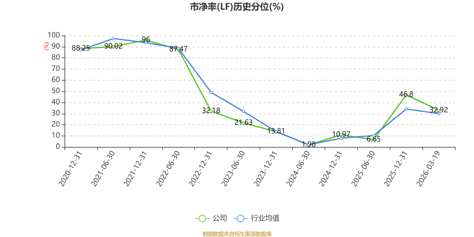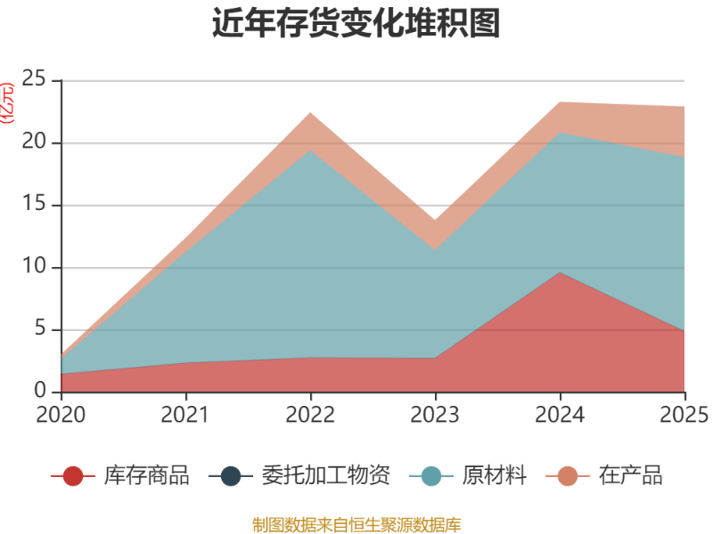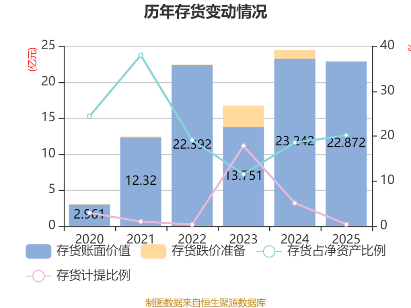从存货变动来看,截至2025年末,公司存货账面价值为22.87亿元,占净资产的20.15%,较上年末减少3701.25万元。其中,存货跌价准备为812.13万元,计提比例为0.35%。