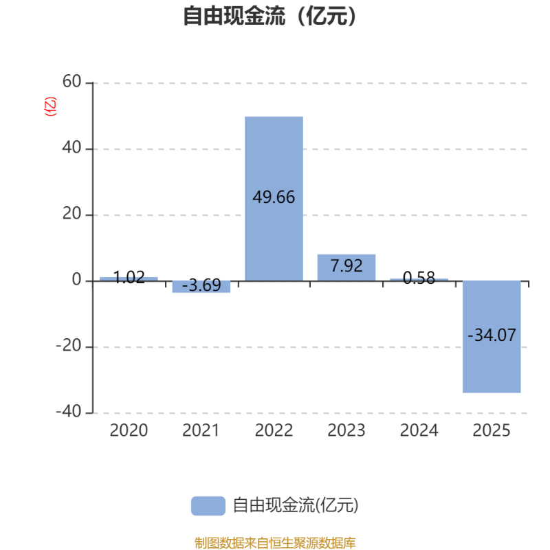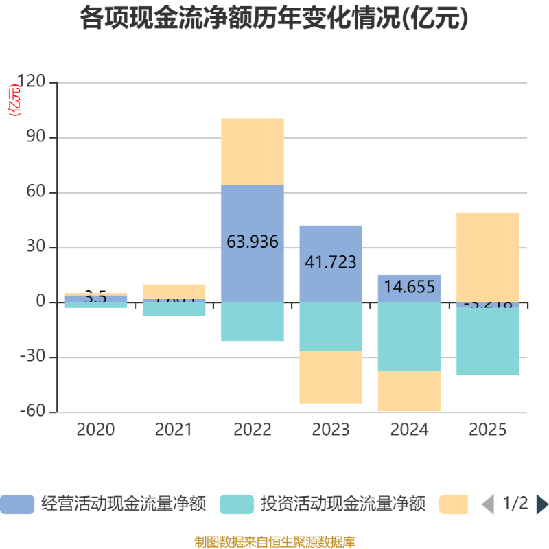 截至2025年,公司经营活动现金流净额为-3.22亿元,同比减少17.87亿元;筹资活动现金流净额48.64亿元,同比增加70.67亿元;投资活动现金流净额-36.76亿元,上年同期为-37.71亿元。