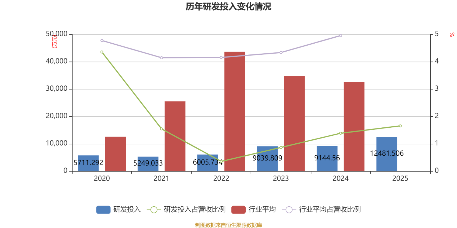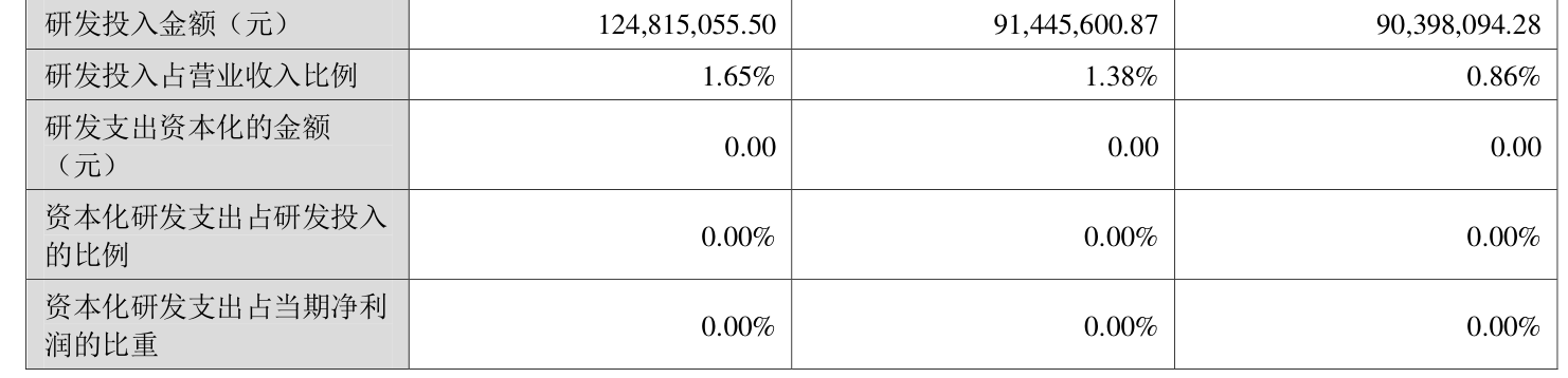 2025年全年,公司研发投入金额为1.25亿元,同比增长36.49%;研发投入占营业收入比例为1.65%,相比上年同期上升0.27个百分点。此外,公司全年研发投入资本化率为0%。