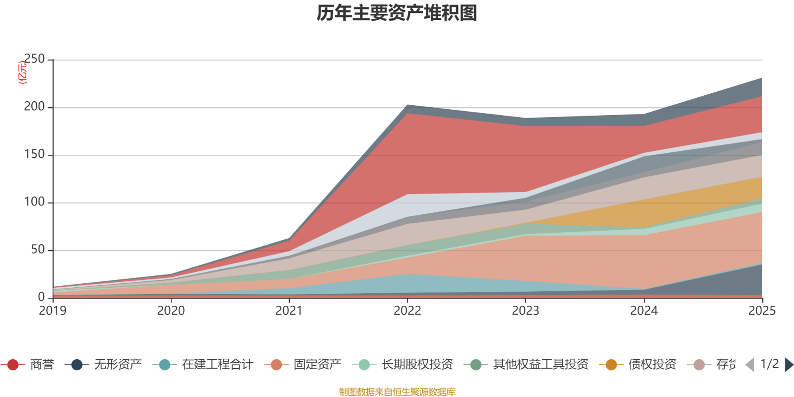 资产重大变化方面,截至2025年末,公司无形资产较上年末增加522.75%,占公司总资产比重上升11.22个百分点;交易性金融资产合计较上年末减少81.02%,占公司总资产比重下降7.16个百分点;固定资产较上年末减少5.34%,占公司总资产比重下降6.13个百分点;债权投资较上年末减少22.57%,占公司总资产比重下降5.35个百分点。