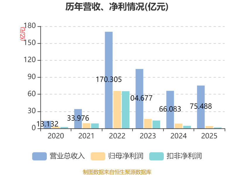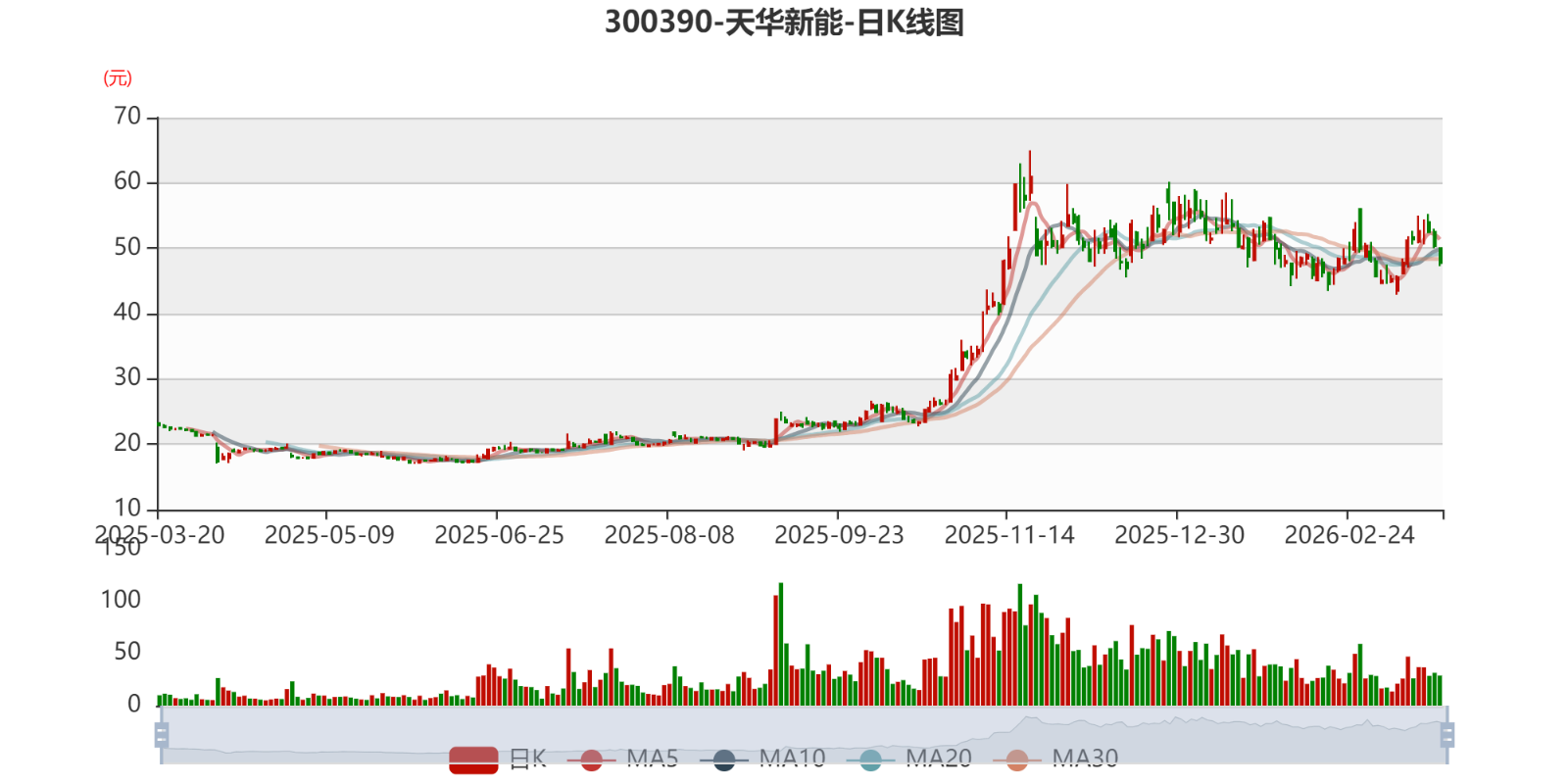 中证智能财讯天华新能(300390)3月20日披露2025年年度报告。2025年,公司实现营业总收入75.49亿元,同比增长14.23%;归母净利润4.02亿元,同比下降51.77%;扣非净利润1.5亿元,同比下降65.90%;经营活动产生的现金流量净额为-3.22亿元,上年同期为14.65亿元;报告期内,天华新能基本每股收益为0.48元,加权平均净资产收益率为3.16%。