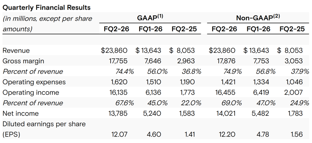 当地时间3月18日,美光科技发布截至2月26日的2026财年第二财季财报,公司营收大幅增长至238.6亿美元,去年同期为80.5亿美元,同比增长196%,远高于市场预期的200.7亿美元;GAAP净利润大幅跃升至137.9亿美元,上年同期仅为15.8亿美元;非GAAP调整后每股收益(EPS)为12.20美元,高于市场预期的9.31美元。同时,公司毛利率大幅提升至74.4%,较去年同期的36.8%相比实现翻倍增长。