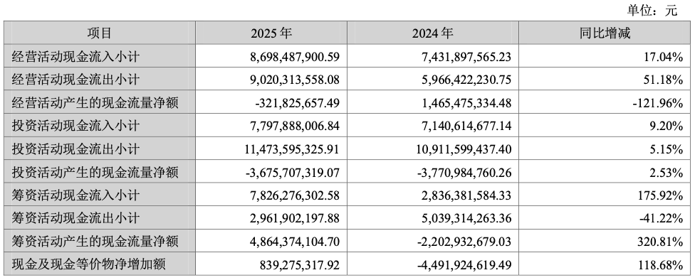 此外,天华新能还陷入现金流恶化的困境。公司经营活动现金流净额从2023年的41.72亿元骤降至2024年的14.65亿元,2025年进一步恶化,同比降121.96%至-3.22亿元。