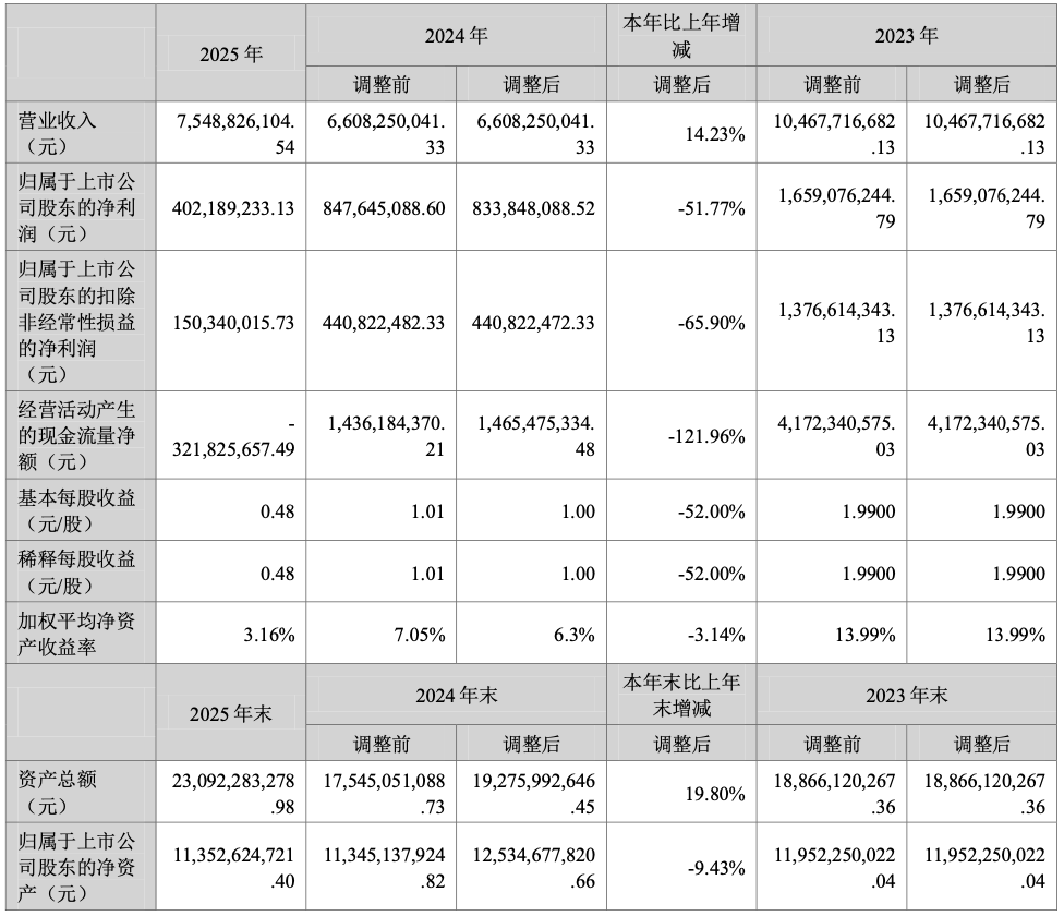 3月19日,天华新能(300390)发布2025年年报,公司2025年实现营业收入75.49亿元,同比增长14.23%;归属于上市公司股东的净利润40218.92万元,同比减少51.77%;归属于上市公司股东的扣除非经常性损益的净利润15034.00万元,同比减少65.90%;基本每股收益0.48元,同比减少52.00%。