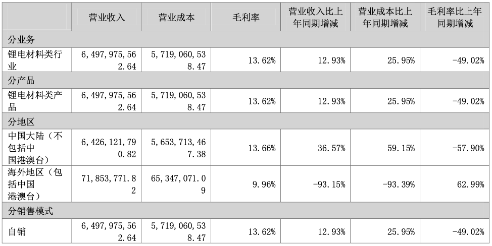 根据2025年年报,毛利率方面,公司报告期内锂电材料产品毛利率为13.62%,较上年同比减少49.02%。往期财务数据显示,2022年至2024年公司锂电材料产品毛利率分别为66.77%、27.63%、21.08%。