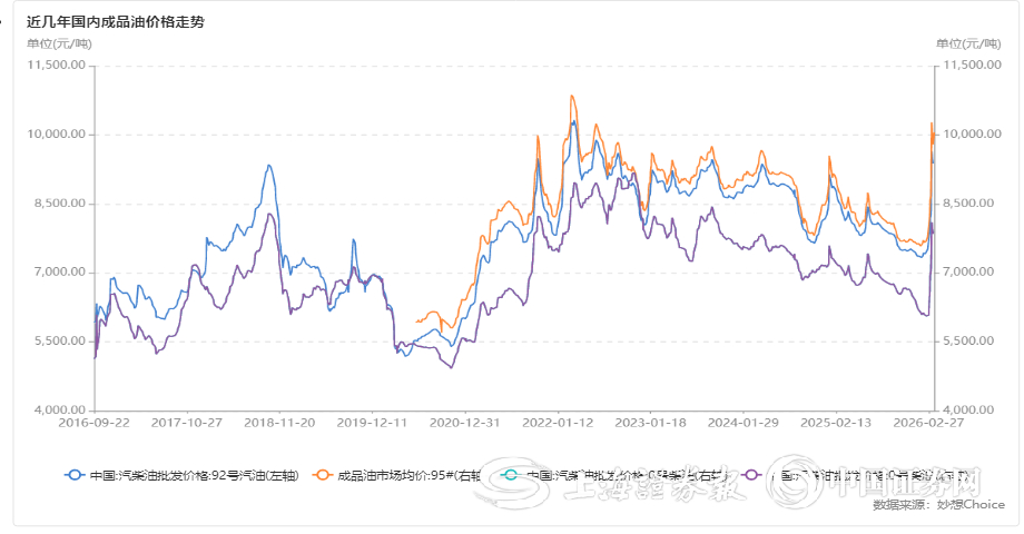 上一轮3月9日调价之时,国内汽柴油零售价格分别上调695元/吨、670元/吨,全国平均来看:92号汽油、95号汽油、0号柴油分别每升上调0.55元、0.58元、0.57元。以95号汽油为例,调价后,多个一线城市的销售价格进入“8元时代”。