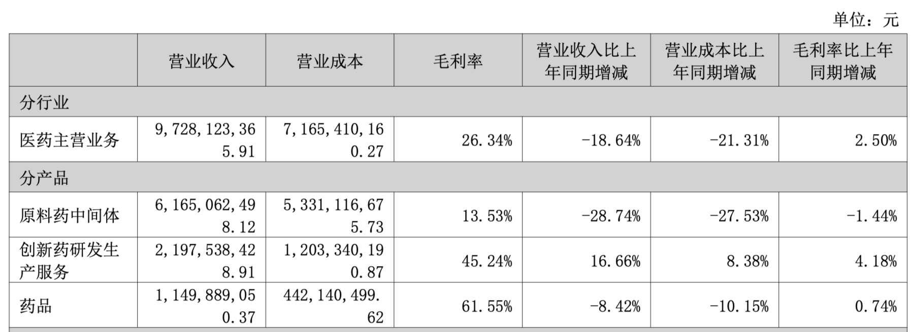 公司原料药中间体业务实现销售收入61.65亿元,同比下降28.74%;实现毛利8.34亿元,同比下降35.59%;毛利率为13.53%,同比下降了1.44个百分点。