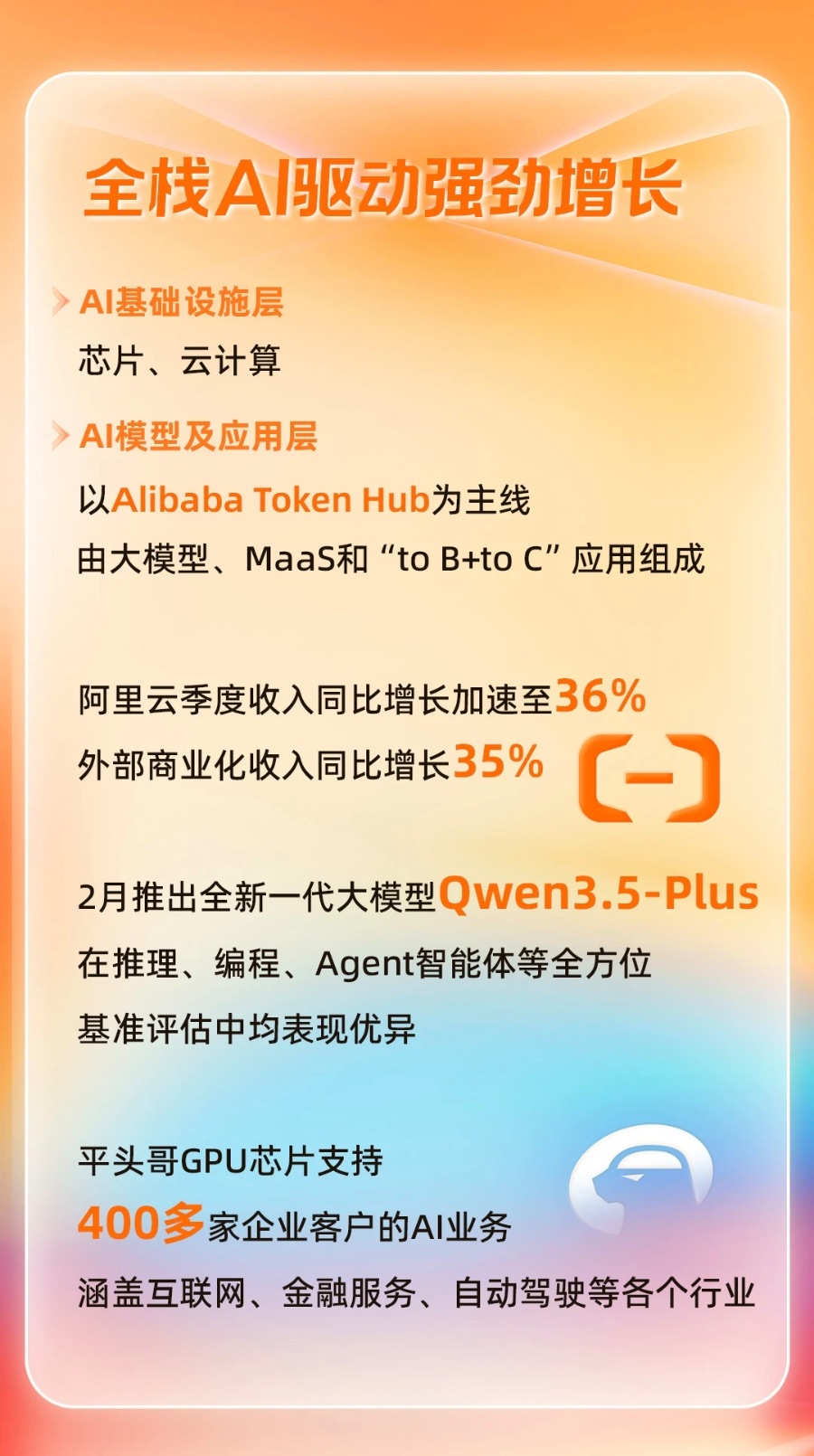财报数据显示,阿里云收入加速增长36%,外部商业化收入增长35%,AI相关产品收入连续第十个季度三位数增长。