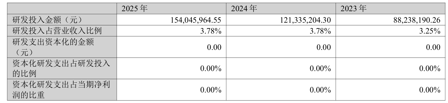 2025年全年,公司研发投入金额为1.54亿元,同比增长26.96%;研发投入占营业收入比例为3.78%,相比上年同期持平。此外,公司全年研发投入资本化率为0%。