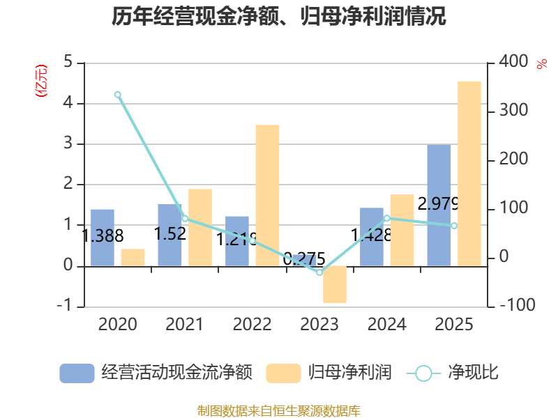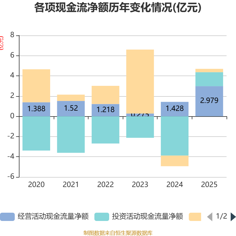 截至2025年,公司经营活动现金流净额为2.98亿元,同比增长108.59%;筹资活动现金流净额3288.3万元,同比增加1.38亿元;投资活动现金流净额1.38亿元,上年同期为-3.88亿元。
