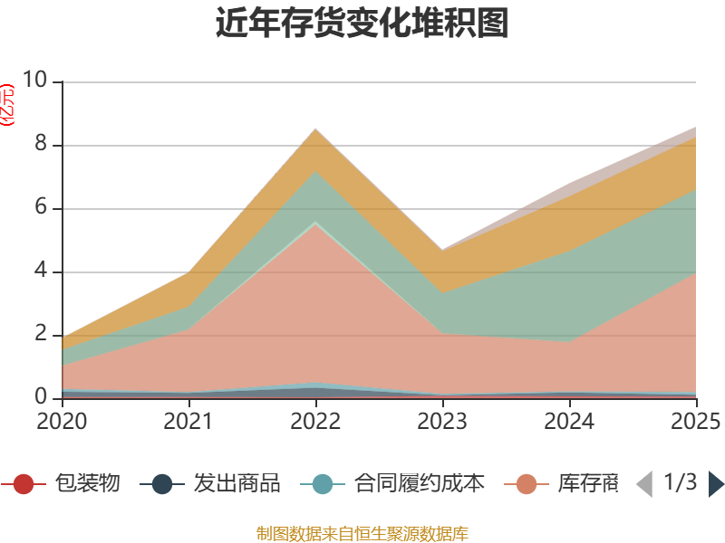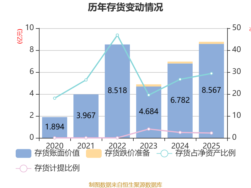 从存货变动来看,截至2025年末,公司存货账面价值为8.57亿元,占净资产的29.36%,较上年末增加1.79亿元。其中,存货跌价准备为1934.01万元,计提比例为2.21%。