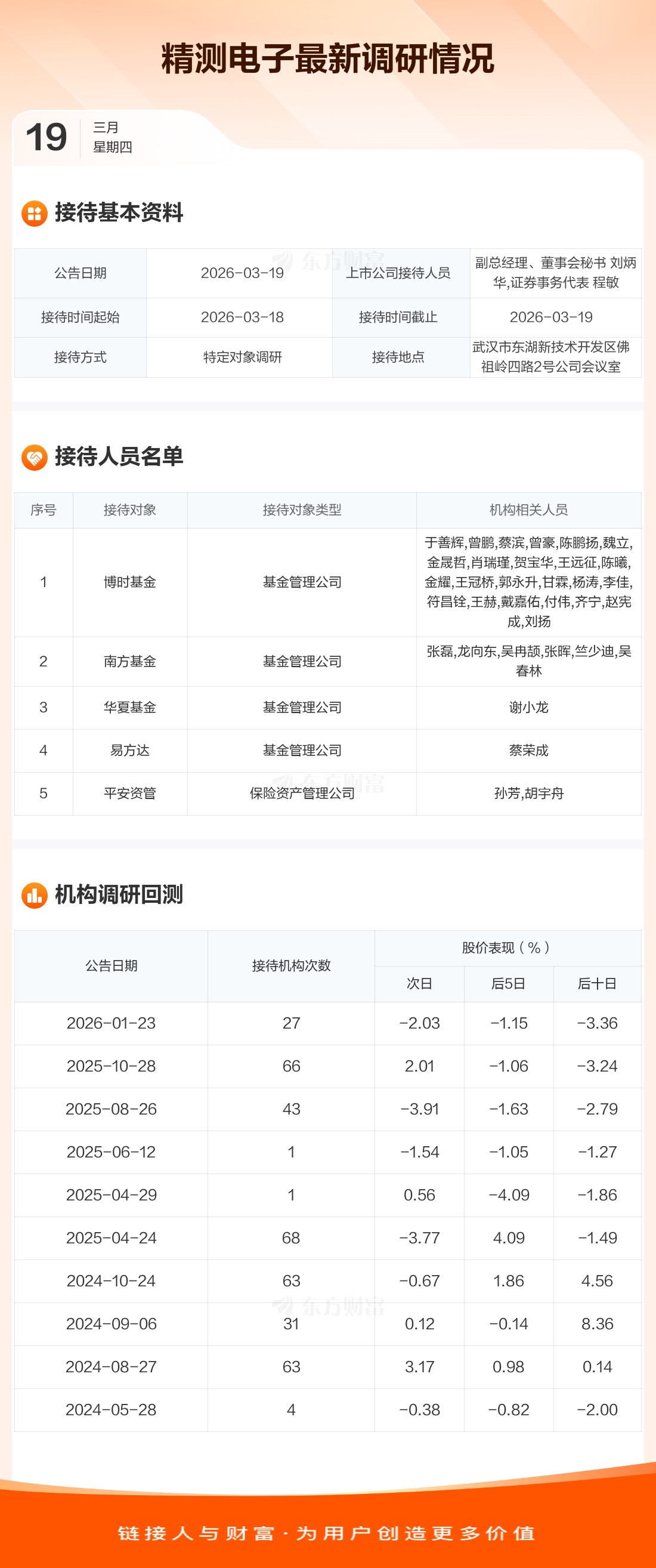 精测电子3月19日公告称,3月18日至3月19日接待博时基金等5家机构调研。接待人员包括副总经理、董事会秘书 刘炳华,证券事务代表 程敏。