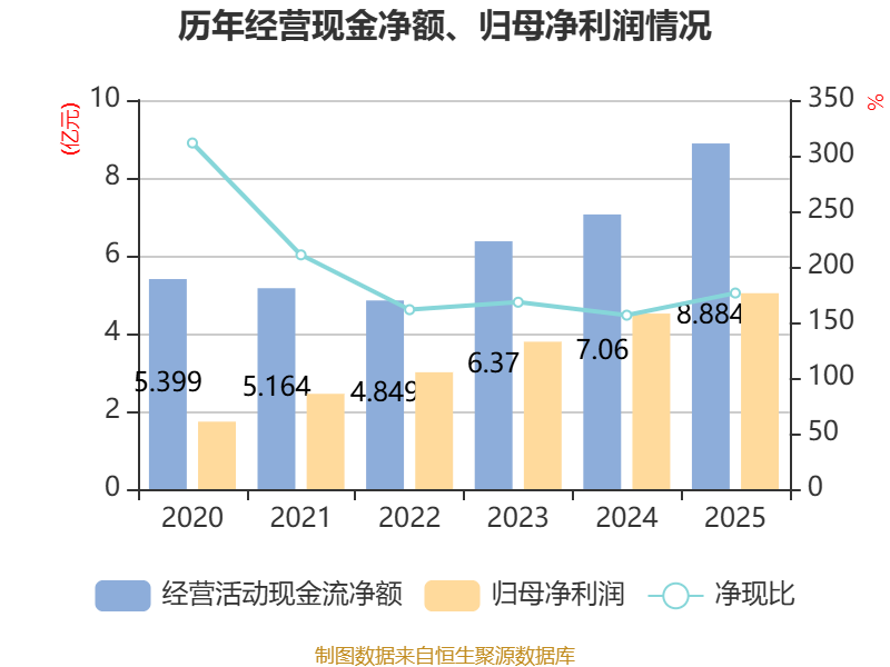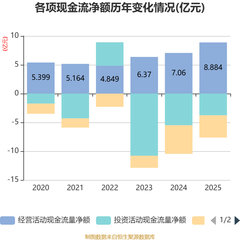 截至2025年,公司经营活动现金流净额为8.88亿元,同比增长25.83%;筹资活动现金流净额-3.86亿元,同比增加1.11亿元;投资活动现金流净额-3.77亿元,上年同期为-5.5亿元。