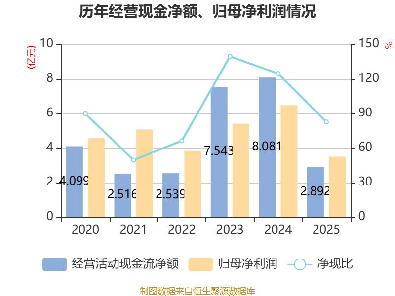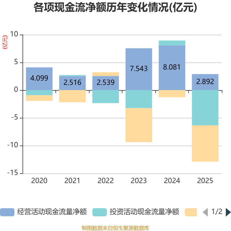 截至2025年,公司经营活动现金流净额为2.89亿元,同比下降64.21%;筹资活动现金流净额-6.55亿元,同比减少5.27亿元;投资活动现金流净额-6.37亿元,上年同期为8602.8万元。