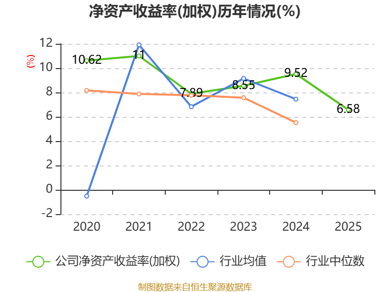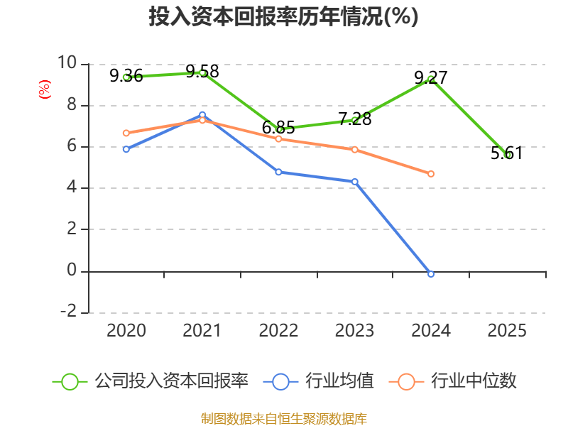 数据显示,2025年公司加权平均净资产收益率为6.58%,较上年同期下降2.94个百分点。公司2025年投入资本回报率为5.61%,较上年同期下降3.66个百分点。