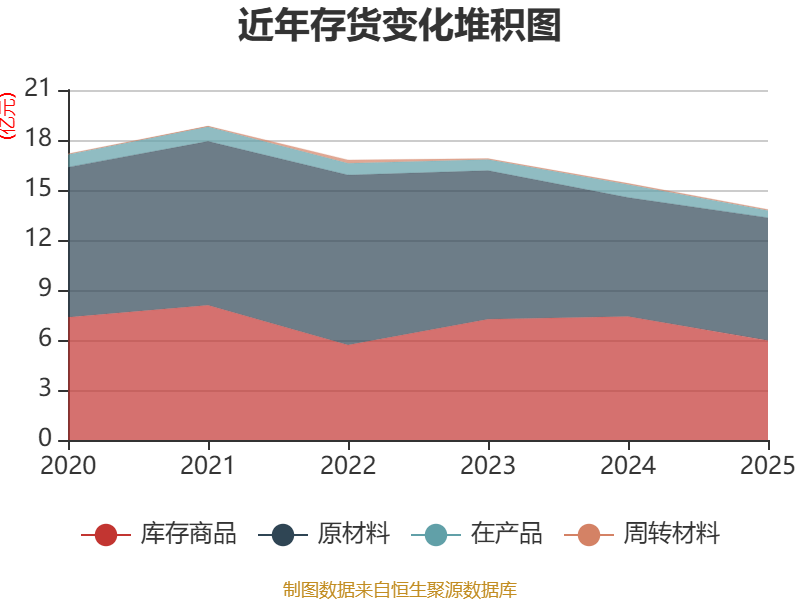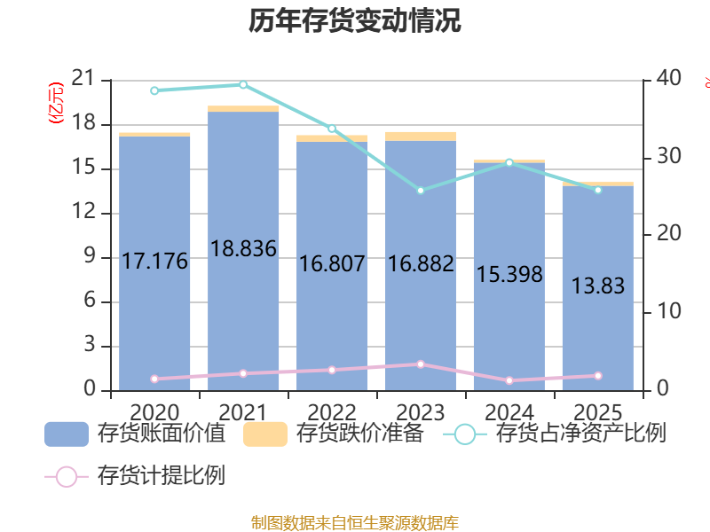 从存货变动来看,截至2025年末,公司存货账面价值为13.83亿元,占净资产的25.79%,较上年末减少1.57亿元。其中,存货跌价准备为2606.33万元,计提比例为1.85%。