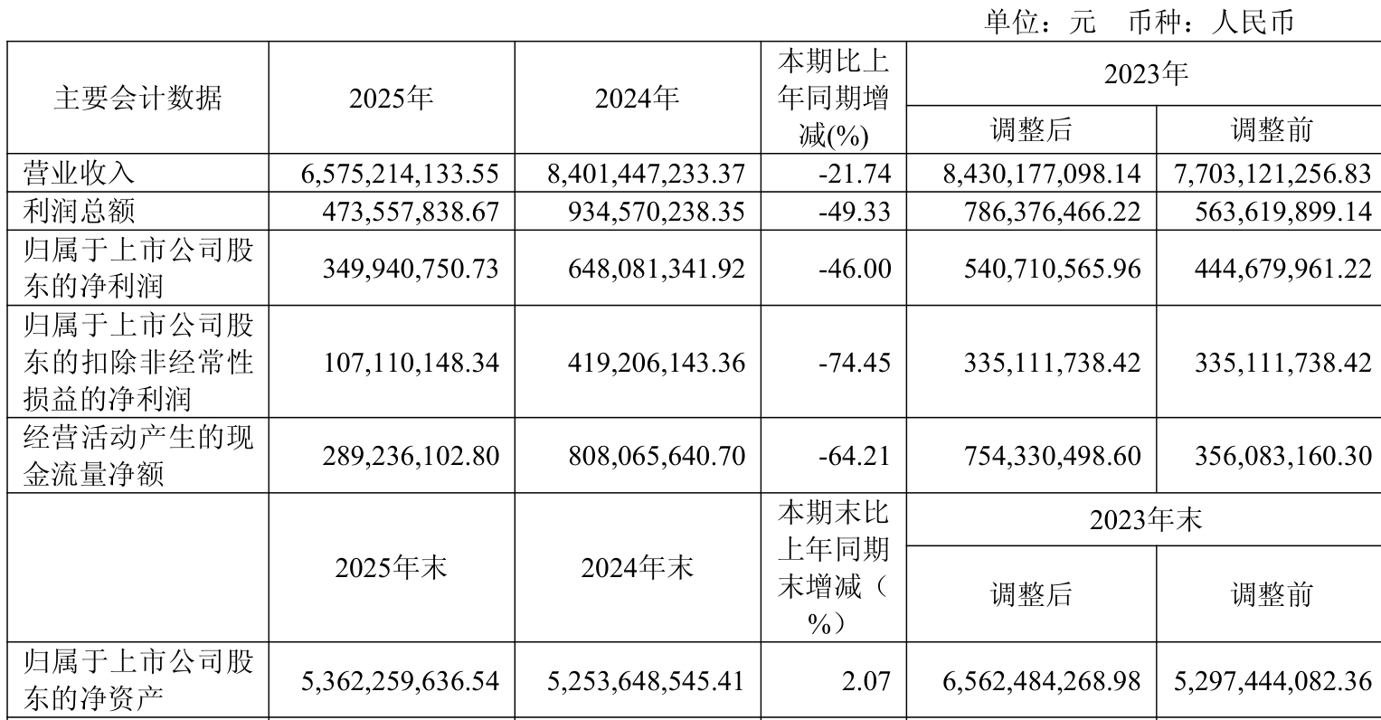 中证智能财讯昆药集团(600422)3月20日披露2025年年度报告。2025年,公司实现营业总收入65.75亿元,同比下降21.74%;归母净利润3.5亿元,同比下降46.00%;扣非净利润1.07亿元,同比下降74.45%;经营活动产生的现金流量净额为2.89亿元,同比下降64.21%;报告期内,昆药集团基本每股收益为0.46元,加权平均净资产收益率为6.58%。公司2025年度分配预案为:拟向全体股东每10股派现1.8元(含税)。
