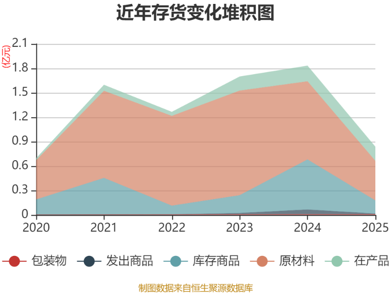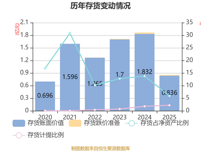 从存货变动来看,截至2025年末,公司存货账面价值为8364.21万元,占净资产的5.89%,较上年末减少9955.95万元。其中,存货跌价准备为187.66万元,计提比例为2.19%。
