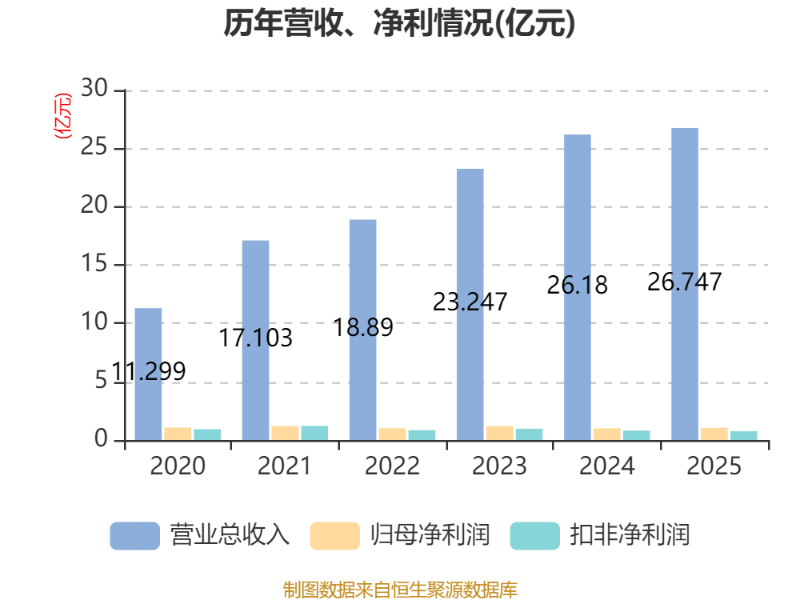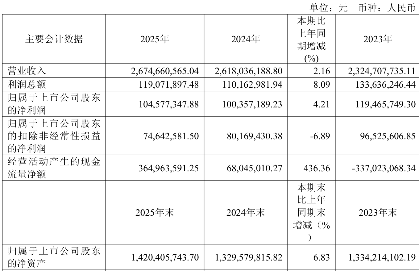 中证智能财讯云中马(603130)3月20日披露2025年年度报告。2025年,公司实现营业总收入26.75亿元,同比增长2.16%;归母净利润1.05亿元,同比增长4.21%;扣非净利润7464.26万元,同比下降6.89%;经营活动产生的现金流量净额为3.65亿元,同比增长436.36%;报告期内,云中马基本每股收益为0.76元,加权平均净资产收益率为7.61%。公司2025年度分配预案为:拟向全体股东每10股派现2.3元(含税)。