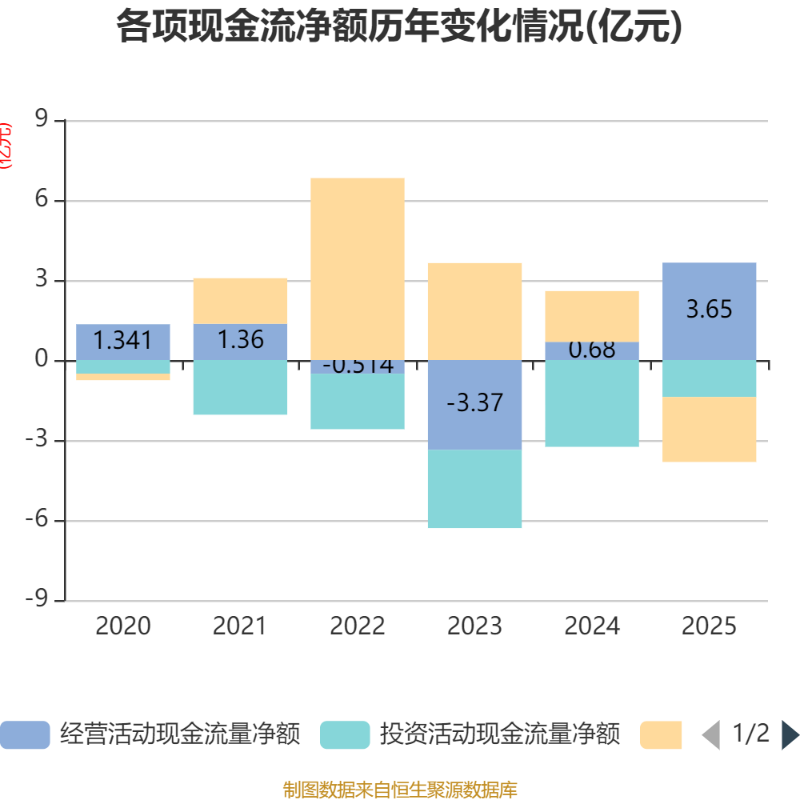 截至2025年,公司经营活动现金流净额为3.65亿元,同比增长436.36%;筹资活动现金流净额-2.44亿元,同比减少4.34亿元;投资活动现金流净额-1.39亿元,上年同期为-3.26亿元。