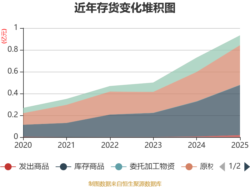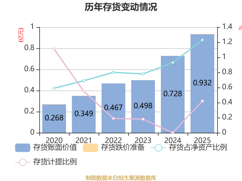 从存货变动来看,截至2025年末,公司存货账面价值为9320.52万元,占净资产的1.23%,较上年末增加2036.22万元。其中,存货跌价准备为39.51万元,计提比例为0.42%。