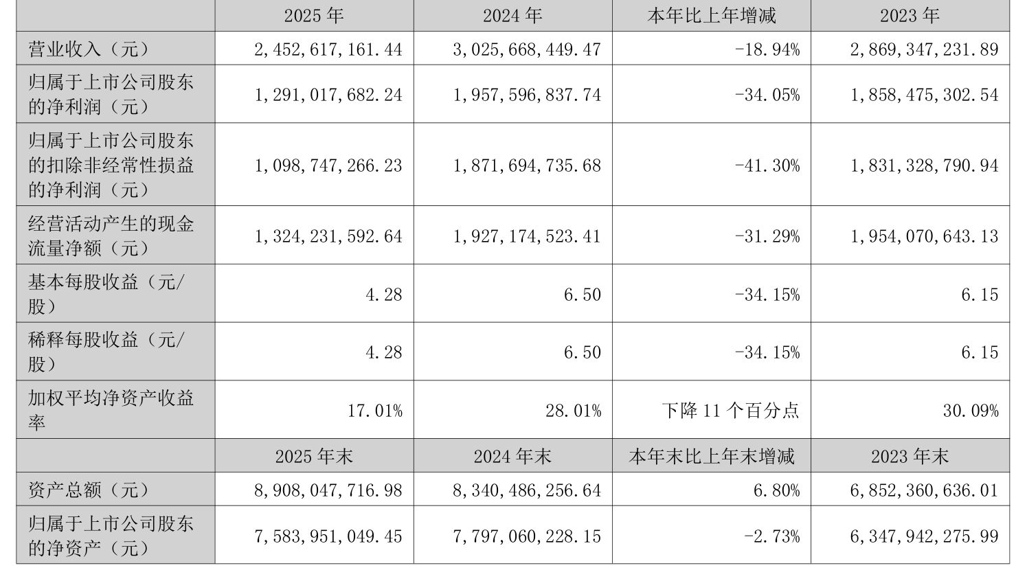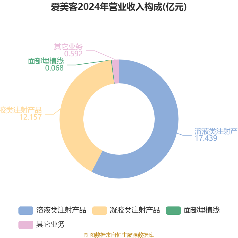 中证智能财讯爱美客(300896)3月20日披露2025年年度报告。2025年,公司实现营业总收入24.53亿元,同比下降18.94%;归母净利润12.91亿元,同比下降34.05%;扣非净利润10.99亿元,同比下降41.30%;经营活动产生的现金流量净额为13.24亿元,同比下降31.29%;报告期内,爱美客基本每股收益为4.28元,加权平均净资产收益率为17.01%。公司2025年度分配预案为:拟向全体股东每10股派现8元(含税)。
