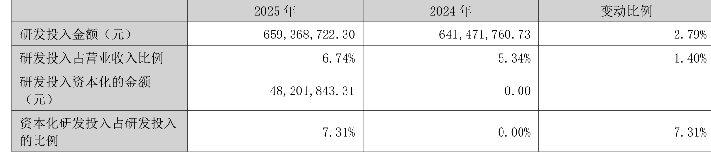 2025年全年,公司研发投入金额为6.59亿元,同比增长2.79%;研发投入占营业收入比例为6.74%,相比上年同期上升1.4个百分点。此外,公司全年研发投入资本化率为7.31%。