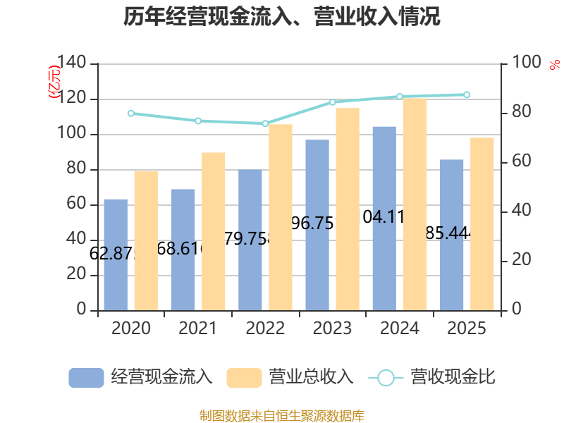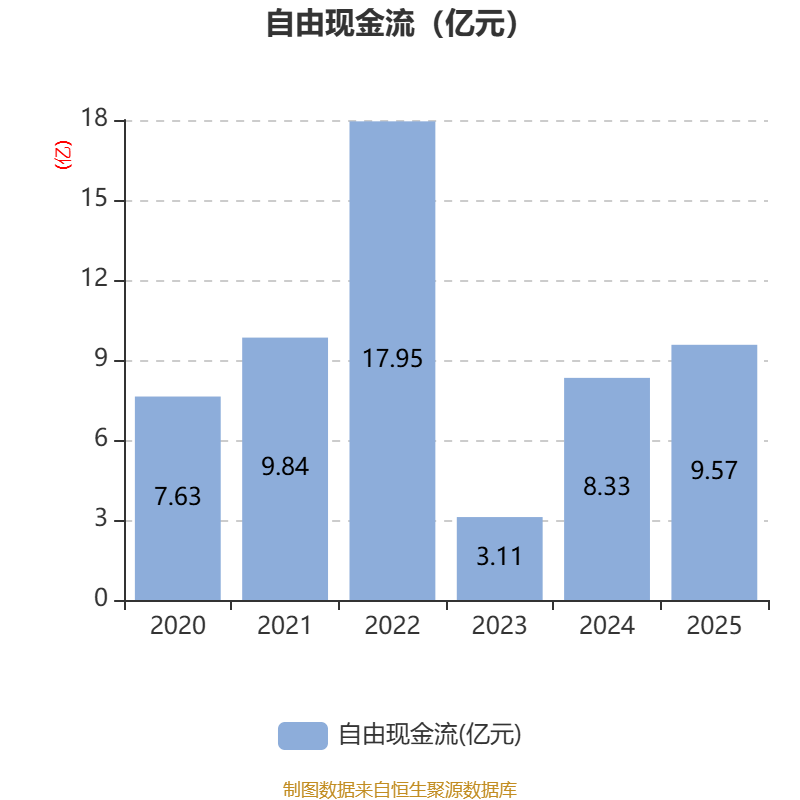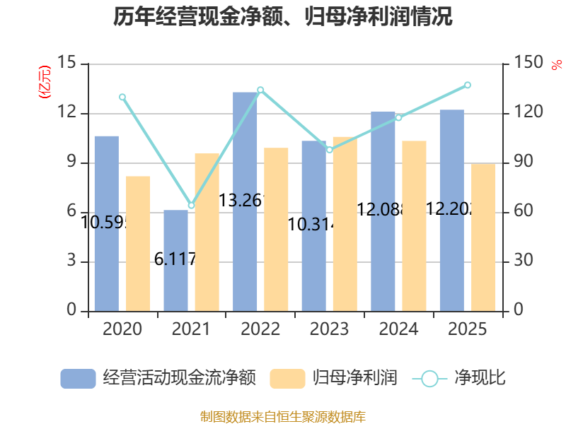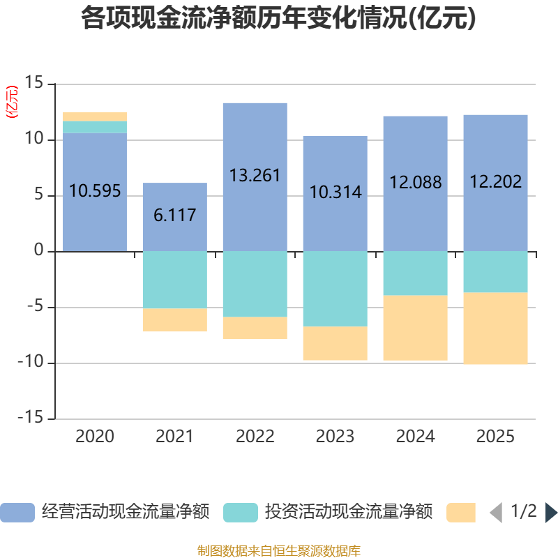 截至2025年,公司经营活动现金流净额为12.2亿元,同比增长0.95%;筹资活动现金流净额-6.43亿元,同比减少6093.51万元;投资活动现金流净额-3.72亿元,上年同期为-3.98亿元。