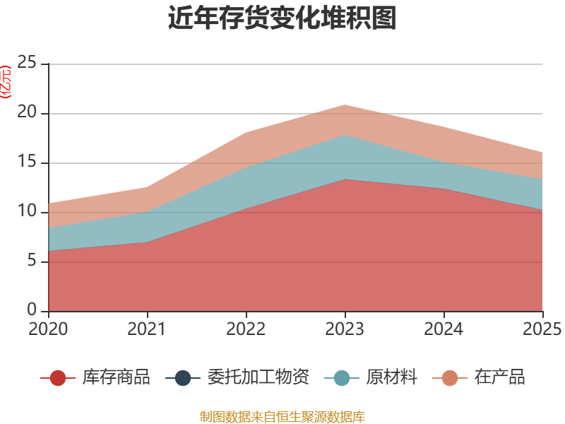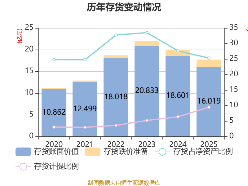 从存货变动来看,截至2025年末,公司存货账面价值为16.02亿元,占净资产的25.27%,较上年末减少2.58亿元。其中,存货跌价准备为1.67亿元,计提比例为9.42%。