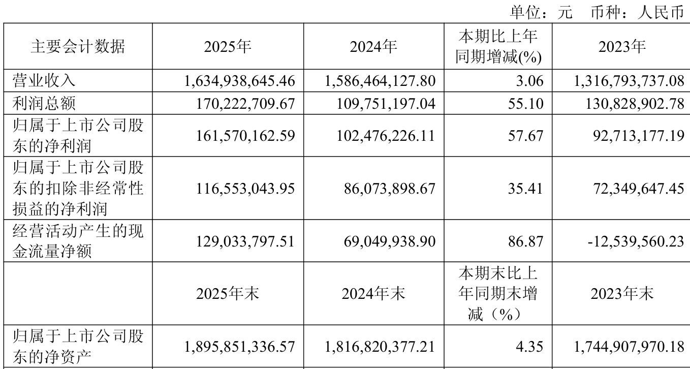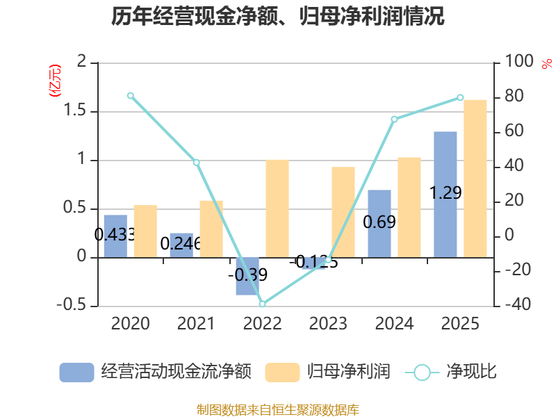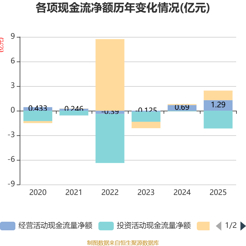截至2025年,公司经营活动现金流净额为1.29亿元,同比增长86.87%;筹资活动现金流净额1.16亿元,同比增加1.05亿元;投资活动现金流净额-2.17亿元,上年同期为-664.38万元。