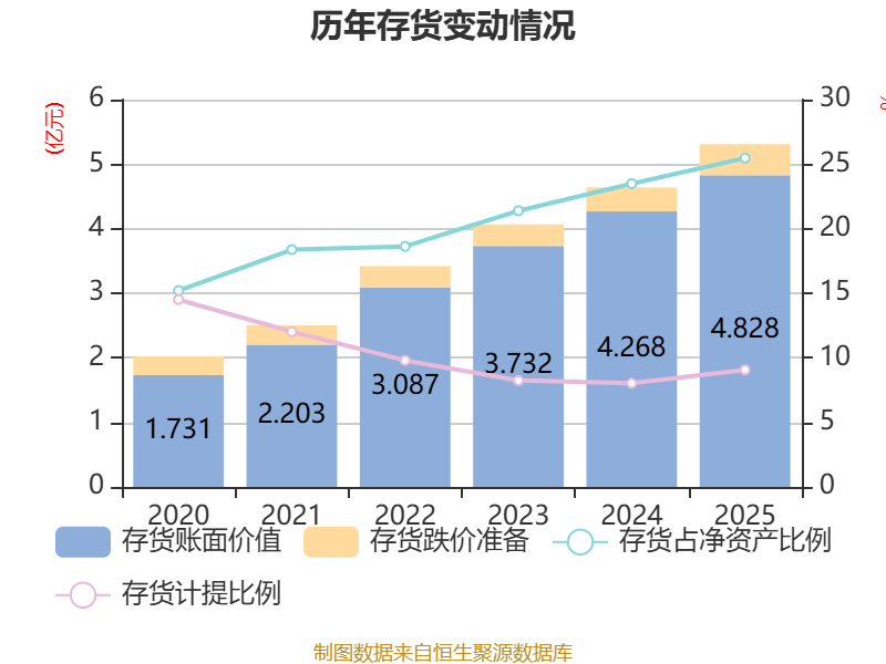 从存货变动来看,截至2025年末,公司存货账面价值为4.83亿元,占净资产的25.47%,较上年末增加5602.75万元。其中,存货跌价准备为4814.82万元,计提比例为9.07%。