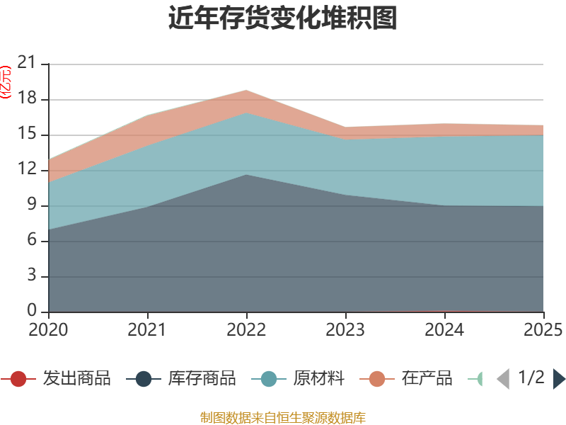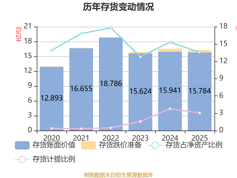 从存货变动来看,截至2025年末,公司存货账面价值为15.78亿元,占净资产的13.57%,较上年末减少1567.82万元。其中,存货跌价准备为4944.01万元,计提比例为3.04%。