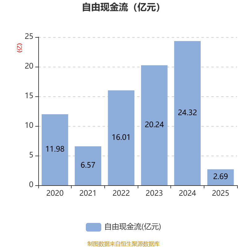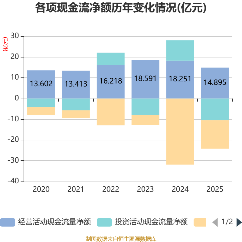截至2025年,公司经营活动现金流净额为14.9亿元,同比下降18.39%;筹资活动现金流净额-13.72亿元,同比增加18.12亿元;投资活动现金流净额-10.46亿元,上年同期为9.82亿元。