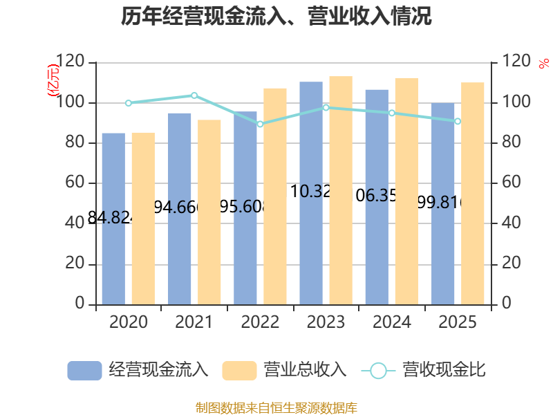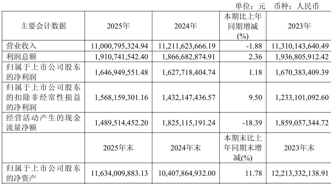 中证智能财讯华润双鹤(600062)3月20日披露2025年年度报告。2025年,公司实现营业总收入110.01亿元,同比下降1.88%;归母净利润16.47亿元,同比增长1.18%;扣非净利润15.68亿元,同比增长9.50%;经营活动产生的现金流量净额为14.90亿元,同比下降18.39%;报告期内,华润双鹤基本每股收益为1.5949元,加权平均净资产收益率为14.86%。公司2025年度分配预案为:拟向全体股东每10股派现3.79元(含税)。