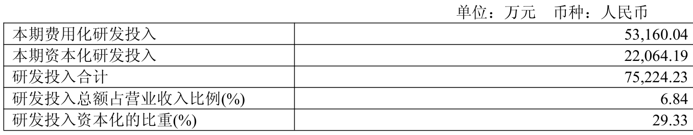 2025年全年,公司研发投入金额为7.52亿元,同比下降5.46%;研发投入占营业收入比例为6.84%,相比上年同期下降0.26个百分点。此外,公司全年研发投入资本化率为29.33%。